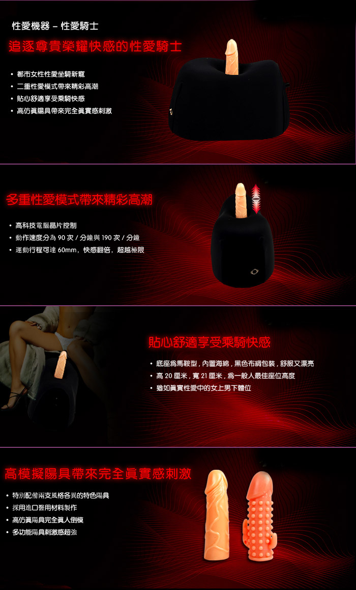 2、激情騎士屬高科技產品,產品的運動均由內置的電腦晶片控制,二級變速(抽插速度分為90次/分與190次/分鐘)。人類在性愛時,男性陽具在女性陰道內的運動行程為53-58mm,性愛騎士運動行程可達60mm,使您得到真實的性愛刺激,也使得快感翻倍,超越極限。