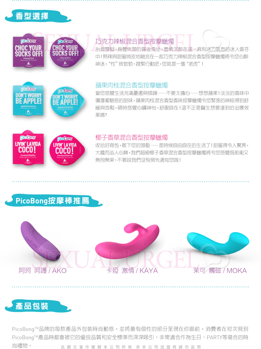 讓皮克朋全新按摩蠟燭助您點燃激情!共有三種迷人香味,在不同的場景下