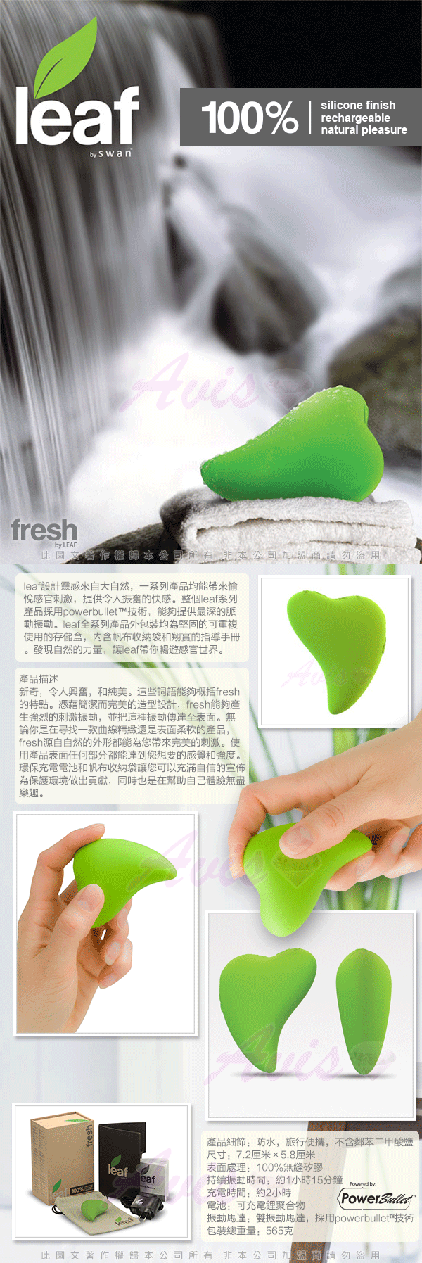 leaf設leaf設計靈感來自大自然,一系列產品均能帶來愉悅感官刺激,提供令人振奮的快感。整個leaf系列產品採用powerbullet™技術,能夠提供最深的脈動振動。leaf全系列產品外包裝均為堅固的可重複使用的存儲盒,內含帆布收納袋和翔實的指導手冊。發現自然的力量,讓leaf帶你暢遊感官世界。