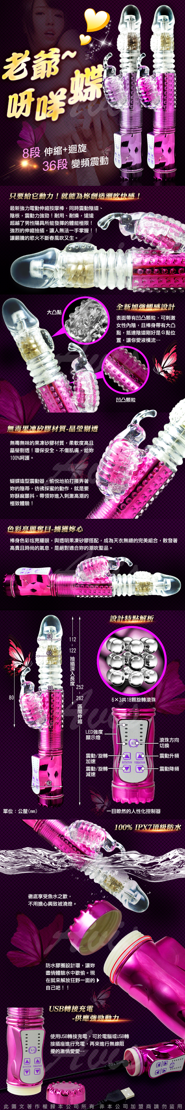 .商品名稱:淫亂若蝶II 288段變頻 滾珠伸縮式 正反轉 按摩棒 亮彩紫 USB充電型