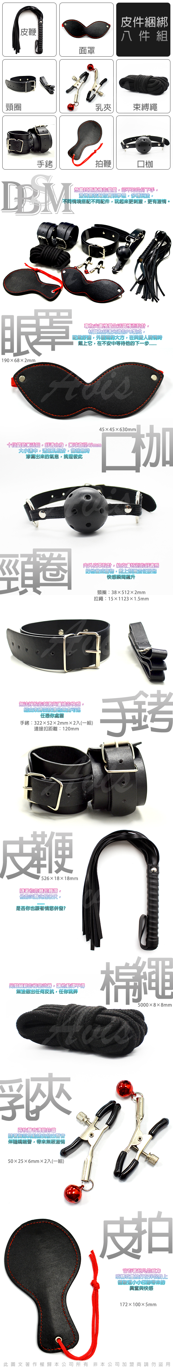 8件套:手手銬、眼罩、皮拍、口塞、乳夾、繩子、鞭子、脖子套 八件組