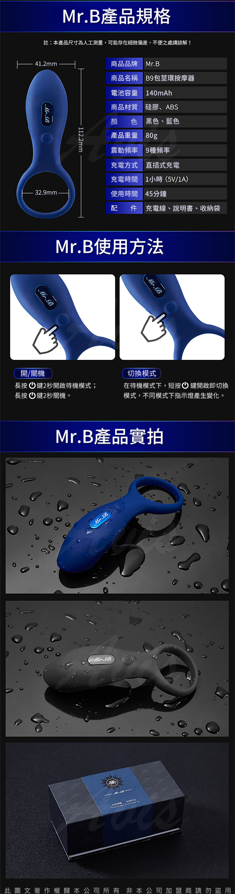 .主商品:Mr.B-B9大漢猛男互震8頻震動套環-藍