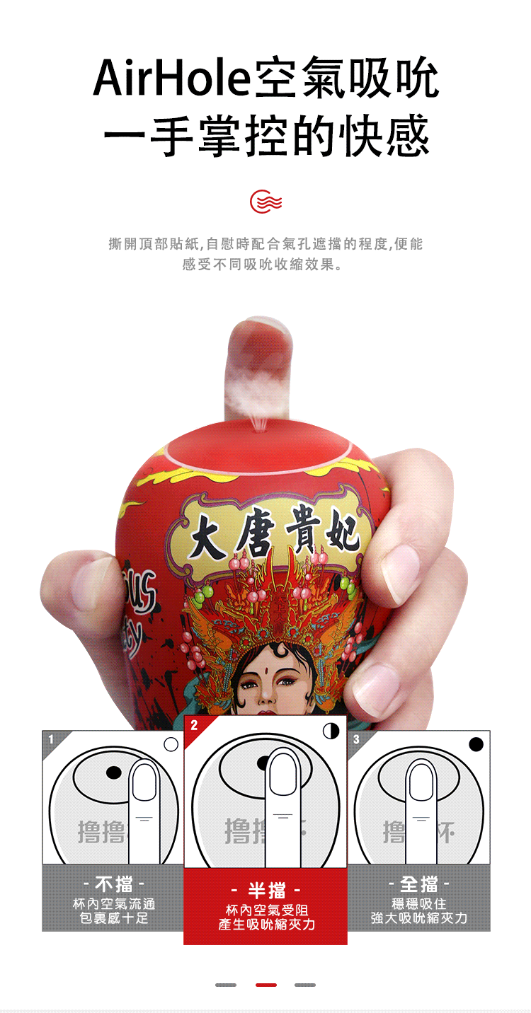 撕開頂部貼紙,自慰時配合氣流遮擋的程度,便能感受不同吸吮收縮效果