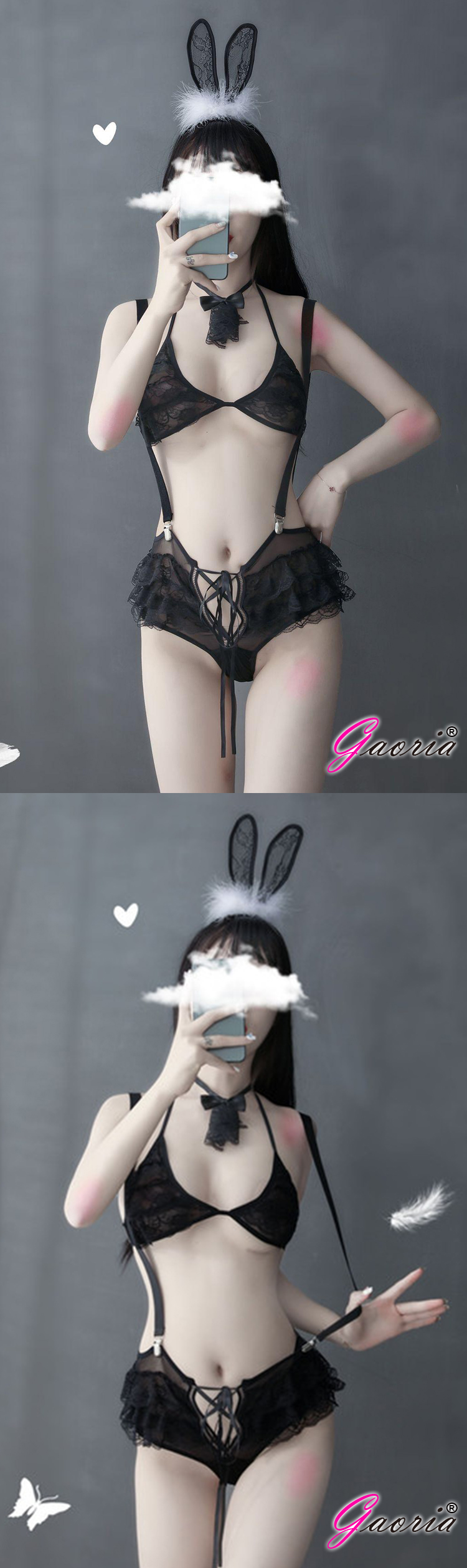· 商品名稱:【Gaoria】兔女郎 性感蛋糕蕾絲 吊帶短褲套裝 黑