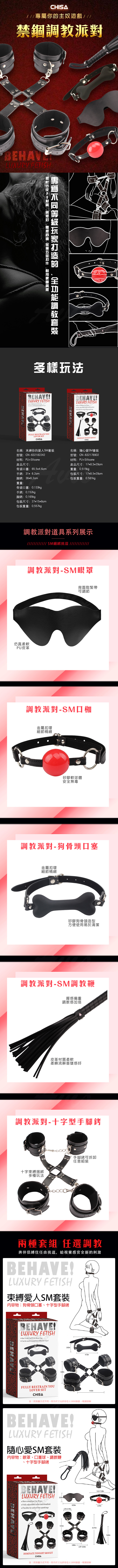 探索極致快感的新境界,CHISA束縛愛人套裝為您帶來全方位的刺激體驗。這套專為不同等級玩家打造的全功能調教套裝,採用柔軟仿皮PU,質感極佳,體感舒適,再配以金屬五金扣件,不僅耐用更顯質感。