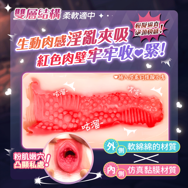 雙層材質結構:柔軟彈性與厚實包覆的完美結合,真實模擬膣感與末端壓迫。